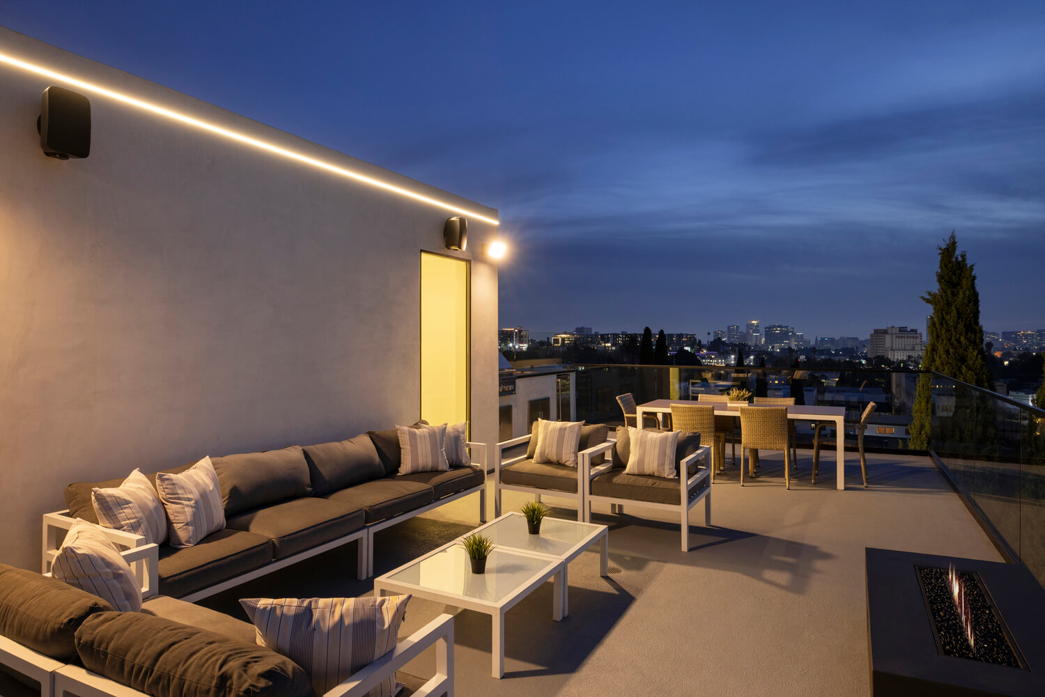 Making your way up the last staircase you will walk out onto your own private rooftop/entertainment/observation lounge. The entire roof was made to hold furniture & friends & comes with an outdoor kitchen. The views from this space are unlimited from downtown, to the Hollywood hills, to the coast & spectacular sunsets every night.